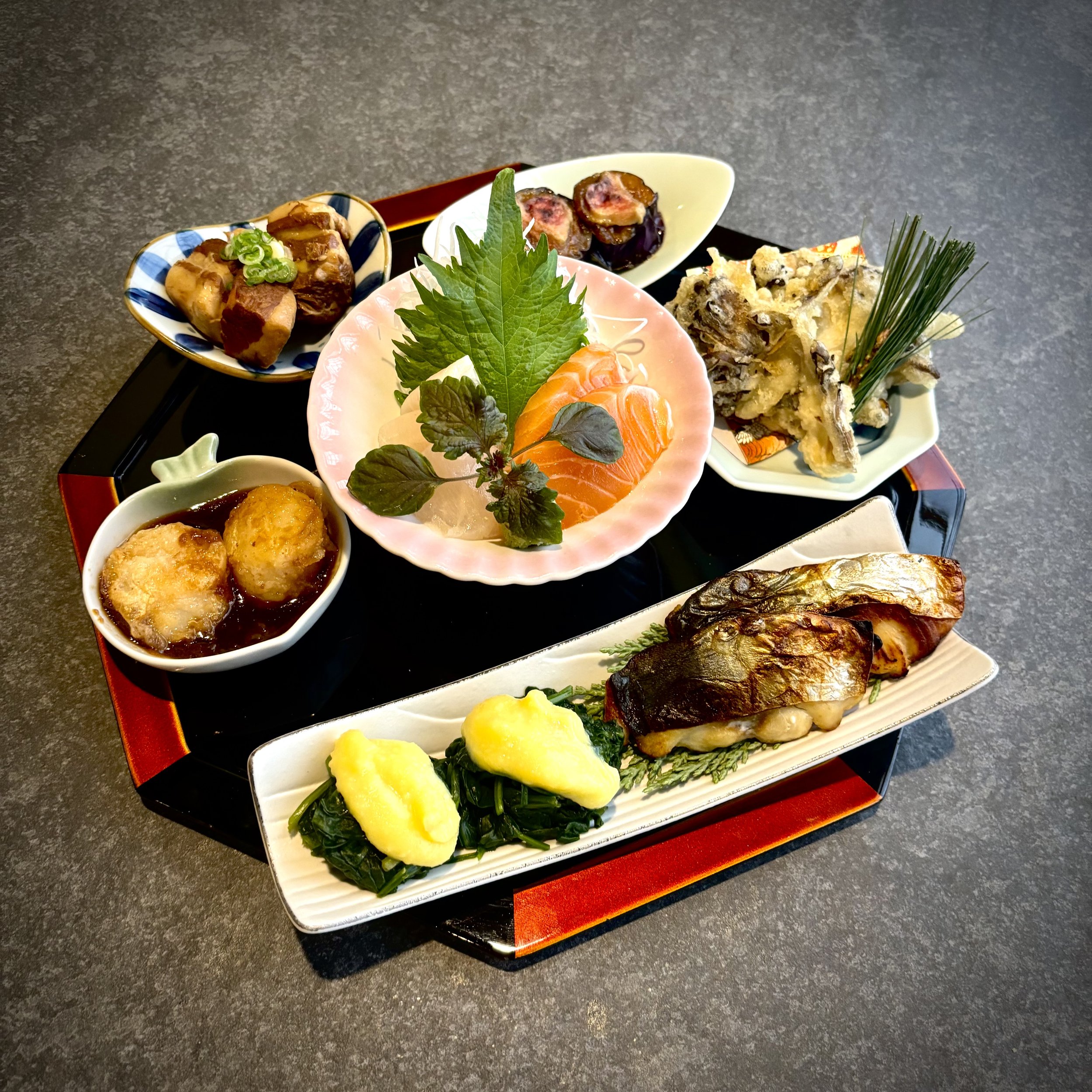 An assortment of 7 small appetizers showcasing traditional Japanese cuisine
